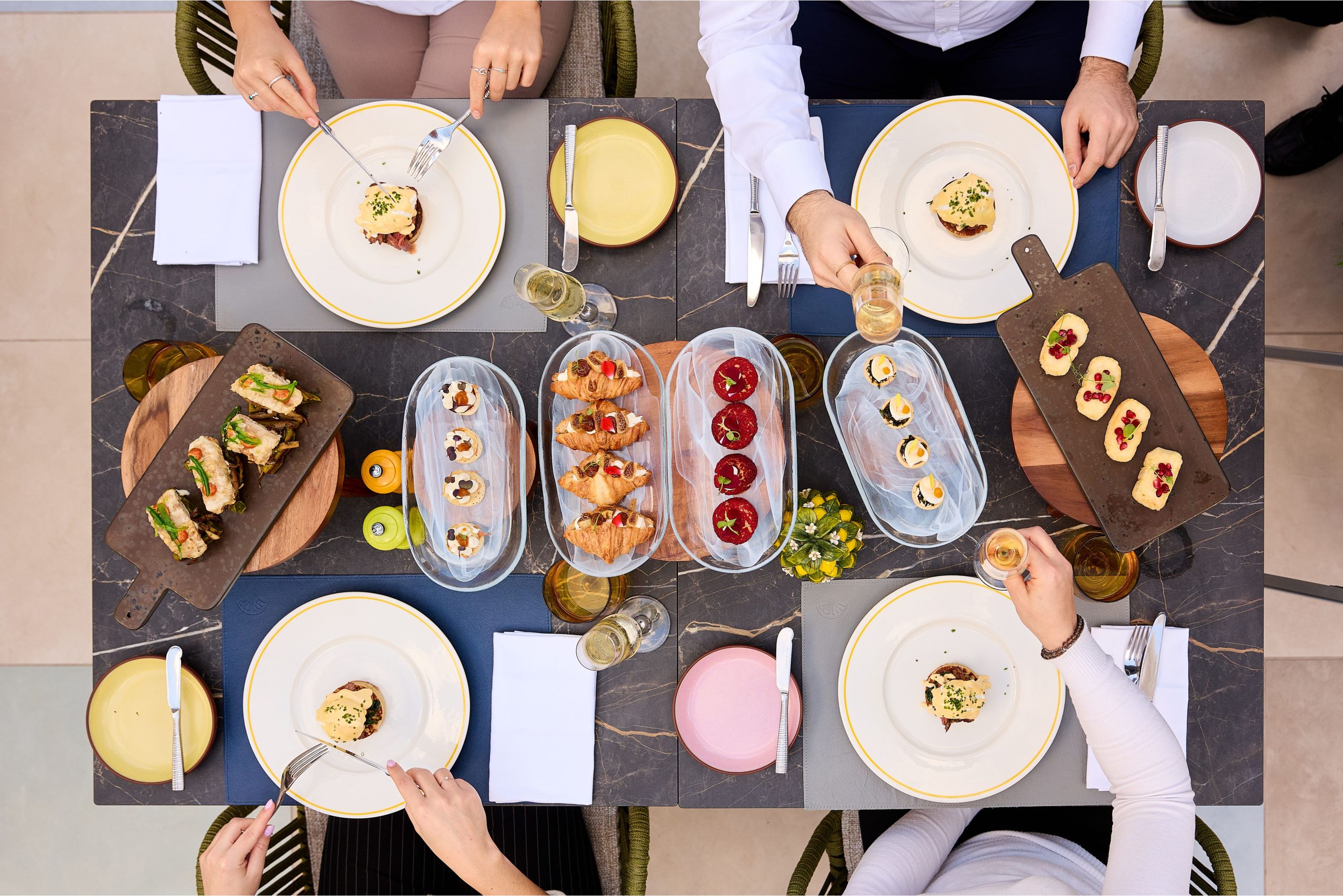 The brunch experience unfolds in an unhurried sequence. It begins with shared, family-style starters, inviting guests to settle in and enjoy the table together. This is followed by an individually served signature dish, an egg Benedict twist with beef flank. The meal then returns to a sharing format for the main course, accompanied by a selection of sides.